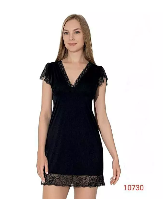 Елегантна нічна сорочка. Модель має глибокий V- подібний виріз із ніжним мереживним оздобленням по декольте та короткими мереживними рукавчиками. Низ виробу також прикрашенний витонченим мереживом, що додає виробу романтичності та легкості.
