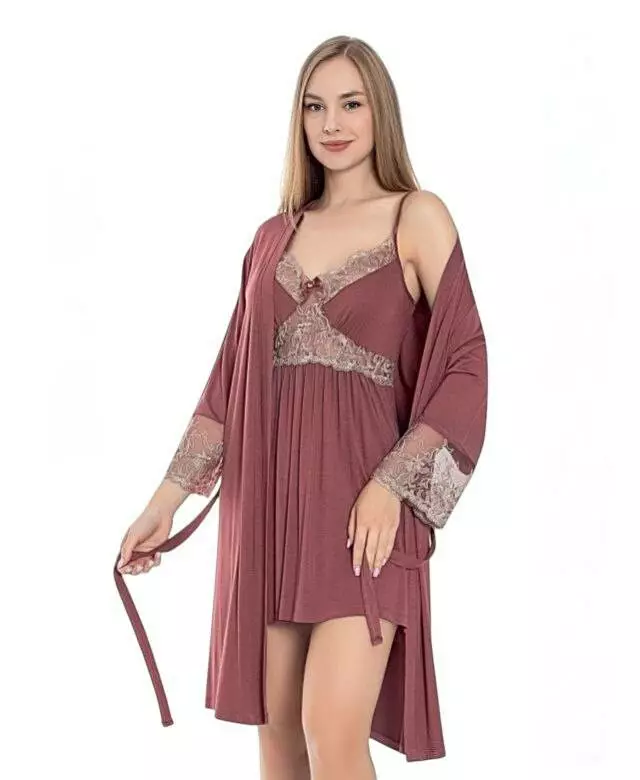 Елегантний жіночий комплект для дому та сну,що складається з нічної сорочки на тонких бретелях та легкого халату. Виконаний з якісної тканини ,нічна сорочка однотонна оздоблена мереживом,халат на запах оздоблений на рукавах мереживом, що додає образу ніжності і жіночності.