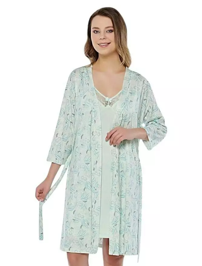 Елегантний жіночий комплект для дому та сну,що складається з нічної сорочки на тонких бретелях та легкого халату. Виконаний з якісної тканини ,нічна сорочка однотонна оздоблена мереживом,халат на запах, що додає образу ніжності і жіночності.