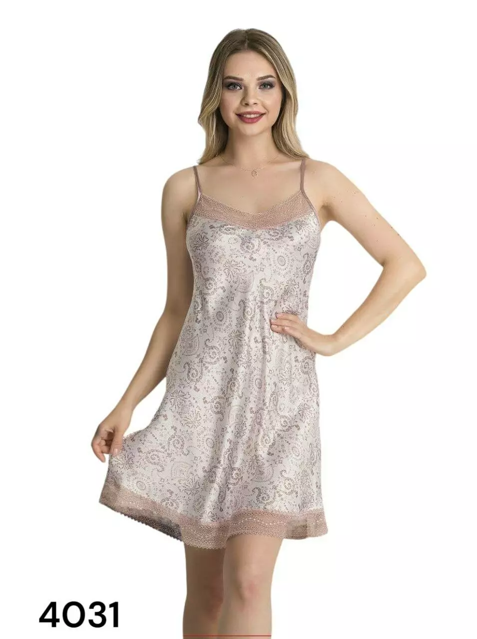 Стильна жіноча нічка сорочка на тоненьких брительках. Виконана з високоякісної тканини з квітковим принтом та оздоблена мереживом.