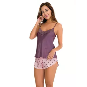 Стильна жіноча атласна піжама. Виконана у поєднанні темнішого верху,оздобленим мереживом на тоненьких брительках. Та світлого низу.