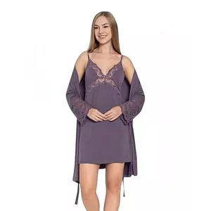 Стильний та романтичний спальний комплект,виконаний з високоякісної тканини турецького виробника. Комплект складається з нічної сорочки оздобленої мереживом на тонких бретелях та легенького халатику на запах.