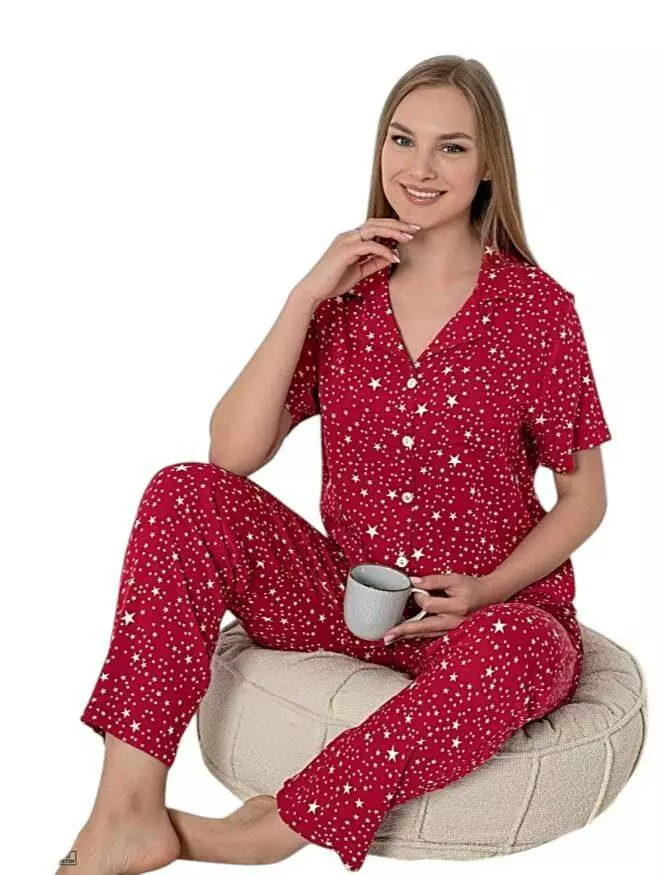 Стильна, яскрава жіноча піжама з принтом у зірочки.Комплект складається з класичної сорочки з комірцем на гудзиках та прямих штанів вільного крою. Стиль та краса у кожній деталі. 100% котон