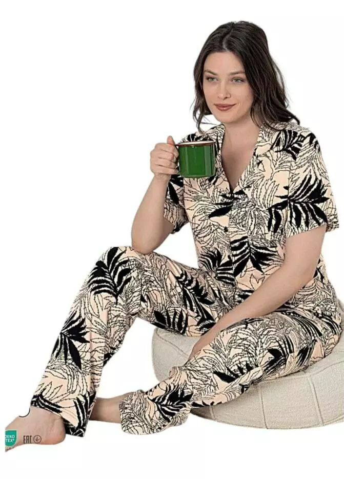 Стильна жіноча піжама з рослинним принтом. Комплект складається з класичної сорочки з комірцем на гудзиках та штанів прямого крою на резинці.