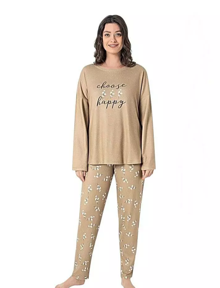 Зручна та приємна на дотик жіноча піжама турецького виробника Cotpark. Виконана з високоякісної тканини. Комплект складається зі зручного лонгсліву оздобленим стильним надписом ,та штанів прямого крою з принтом.
