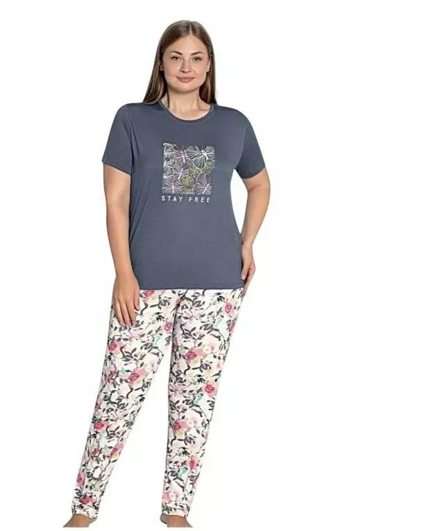 Зручна піжама для жінок від бренду Cotpark. Комплект складається з однотонної футболки з надписом та штанів вільного крою з абстрактним, квітковим візерунком. Ідеальний вибір для затишного відпочинку вдома та комфортного сну.