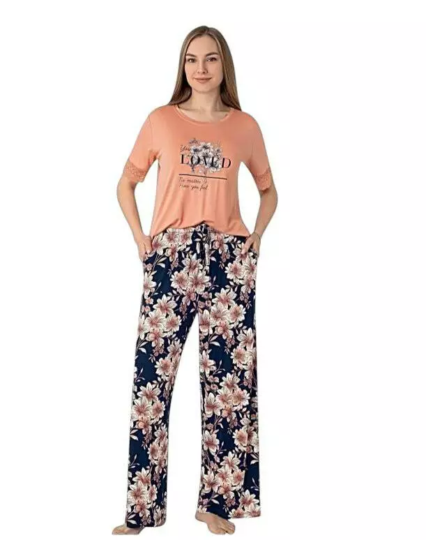 Зручна піжама для жінок від бренду Cotpark. Комплект складається з однотонної футболки з надписом та штанів вільного крою з квітковим принтом. Ідеальний вибір для затишного відпочинку вдома та комфортного сну.