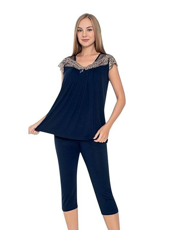 Зручна піжама для жінок від бренду Cotpark. Комплект складається з однотонної футболки оздобленою мереживом та бріджів. Ідеальний вибір для затишного відпочинку вдома та комфортного сну.