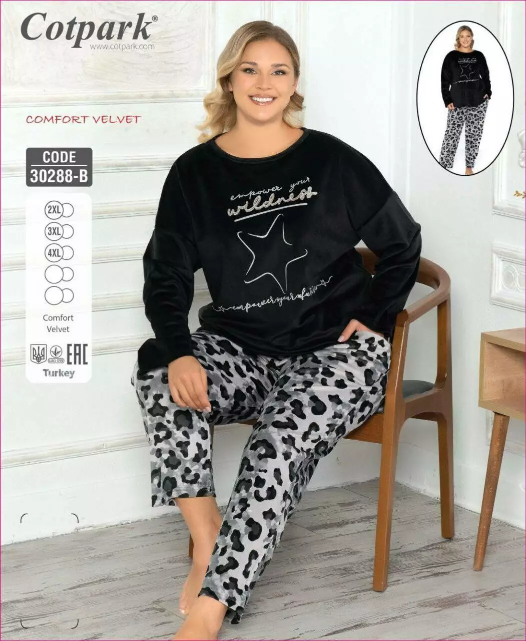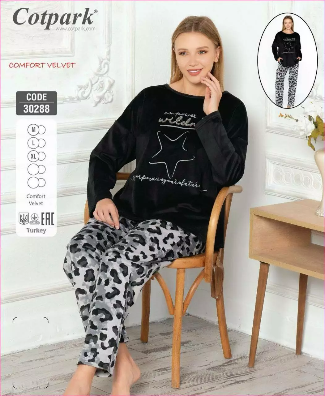 Піжама виробника Cotpark код 30288 склад тканини 96% Поліестер 4 % Еластан.М'яка тепла оксамитова велюрова піжама(кофти чорного кольору з малюнком та штанів прямого крою зав'язками).Призначина для дому та відпочинку.